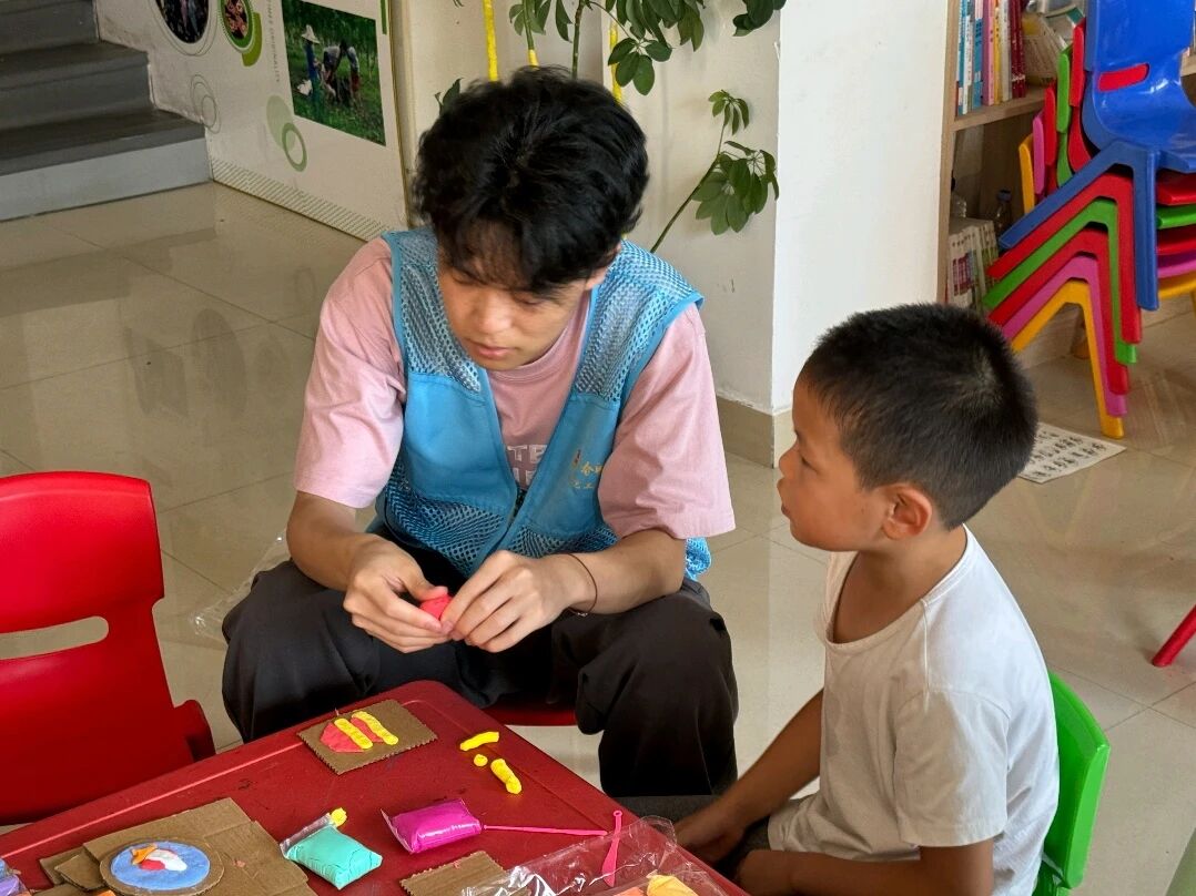 手工制作環節,在志愿者的耐心指導下,小朋友們用硬紙板剪出圓形、星形等底板,利用黏土捏出火箭、衛星等代表著祖國輝煌成就的造型,將自己對“兩彈一星”精神的理解融入作品之中,表達對祖國的熱愛與祝福,最終制作出一個個獨一無二的冰箱貼,現場歡聲笑語不斷。